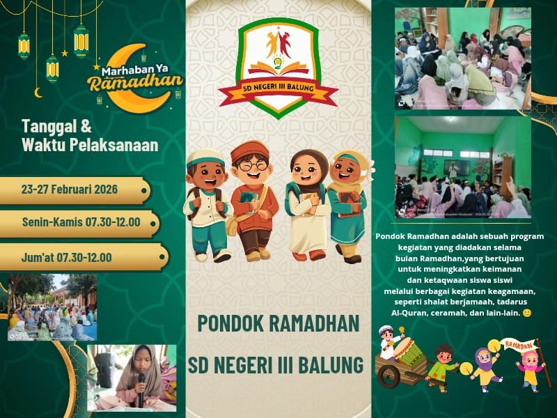 Bulan suci Ramadhan selalu menjadi momen yang dinantikan oleh seluruh warga sekolah. Seperti tahun-tahun sebelumnya, SD Negeri III Balung kembali mengadakan kegiatan Pondok Ramadhan yang diikuti oleh seluruh siswa dengan penuh semangat dan antusias. Sejak pagi hari, suasana sekolah terasa berbeda. Para siswa datang dengan pakaian muslim dan muslimah yang rapi, wajah mereka tampak ceria menyambut kegiatan yang penuh berkah ini.