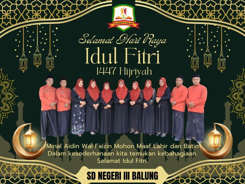Keluarga besar SD NEGERI III BALUNG mengucapkan selamat hari raya idul fitri 1447H minal aidzin wal faidzin mohon maaf lahir dan batin.